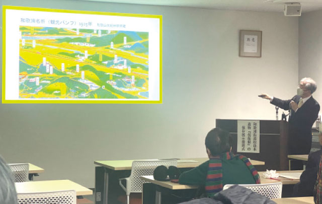 除幕式では、和歌山大学の本山貢学長、和歌浦松並木顕彰会の木下守代表ら6人が幕を引き、その後、同会館セミナールームで経緯説明会が開かれました。