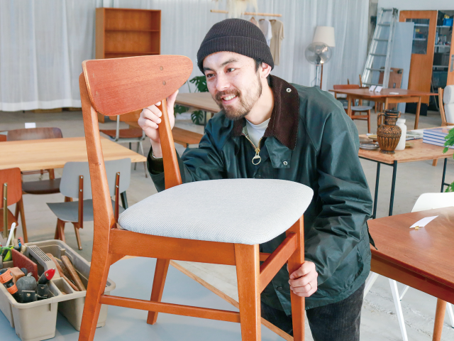 店内は、デンマークやオランダ、スウェーデンのいすや机の他、自身が設計・製作したオリジナル家具をディスプレー。木村さんはいすに触れ、「メンテナンスしながら長く大事に使われてきたもの。デザインや機能性に優れ、年月を経て味わい深い木色になっています」と、その良さを伝えます。傷や汚れも特長の一つ。「捨てるのではなく、メンテナンスしながら使い続けることが当たり前の社会に。この場所でサポート、そして発信していきます」と目を輝かせています。