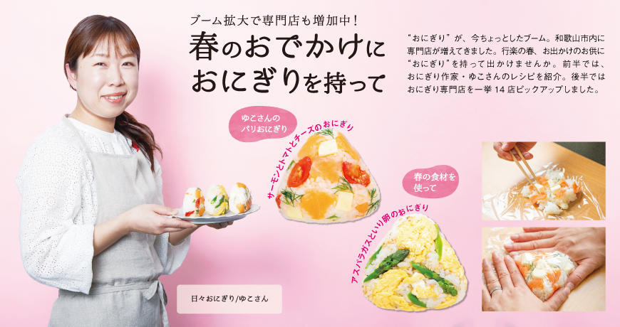 “おにぎり”が、今ちょっとしたブーム。和歌山市内に専門店が増えてきました。行楽の春、お出かけのお供に“おにぎり”を持って出かけませんか。前半では、おにぎり作家・ゆこさんのレシピを紹介。後半ではおにぎり専門店を一挙14店ピックアップしました。