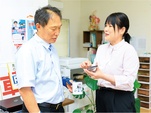 業務外の会話も信頼関係の土台に(長田健嗣代表取締役(左)と谷本さん)