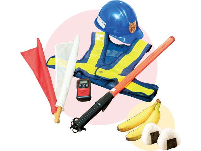 ーヘルメットや無線機などの道具一式は車に積んでいます。現場に出るときは、おにぎりとバナナも忘れません!