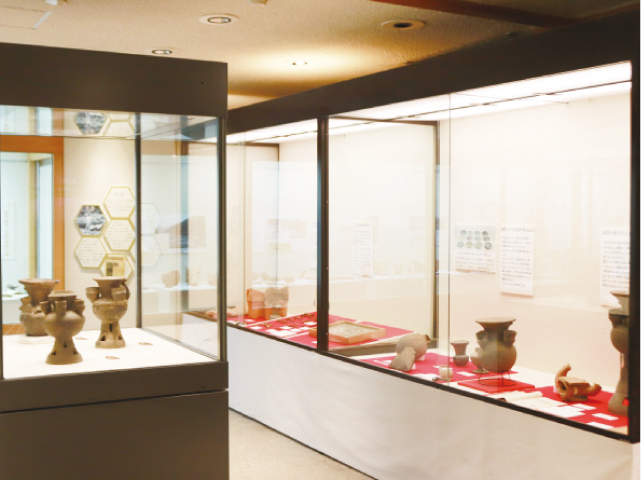 会場では、現資料館の建設以前、岩橋千塚古墳群の本格的な学術調査が始まった明治期から、戦後の開発で古墳群が消滅の危機にあった昭和30年代までの調査と歴史を紹介。初出展の土器や資料も見どころの一つです。また、紀伊風土記の丘誕生時の構想図や建築模型が並び、当時の人たちの思いに触れる他、「見る」から「体験」「参画」へと変化してきた同館の活動も取り上げています。