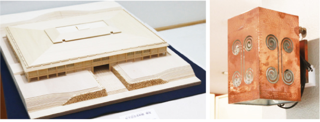 現資料館の建築模型(左)、発掘品がモチーフの電灯(右)