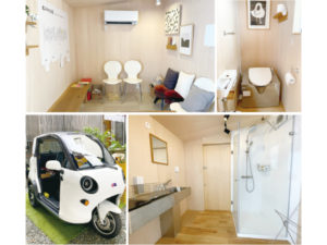 「インフラゼロハウス」にはシャワーもトイレもキッチンも完備。次世代ソーラーEV三輪車もまちづくりの一助に