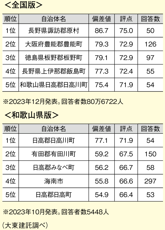 大東建託が運営する「賃貸未来研究所」が、居住満足度調査「いい部屋ネット・街の幸福度ランキング2023」の和歌山県版を昨年10月に、全国版を12月に発表。日高郡日高川町が県版で1位、全国版では1369市区町村の中から5位にランクインしました(下記参照)。