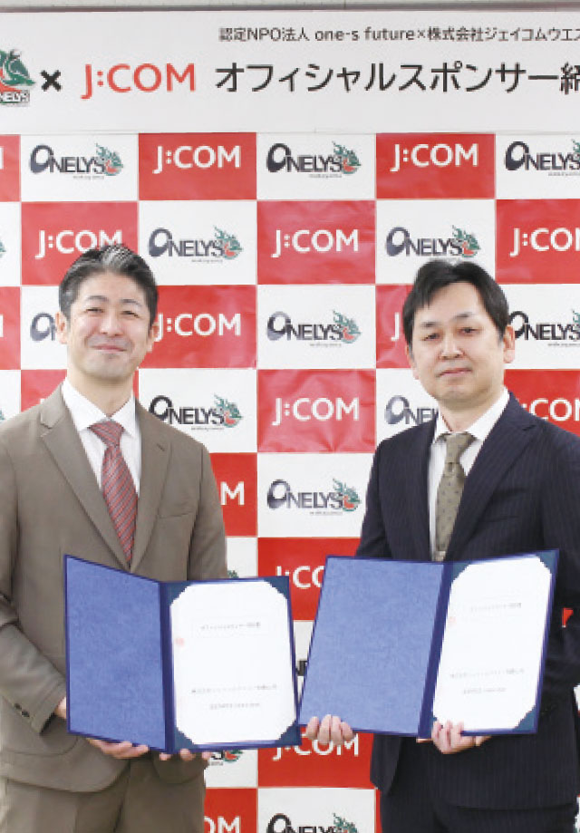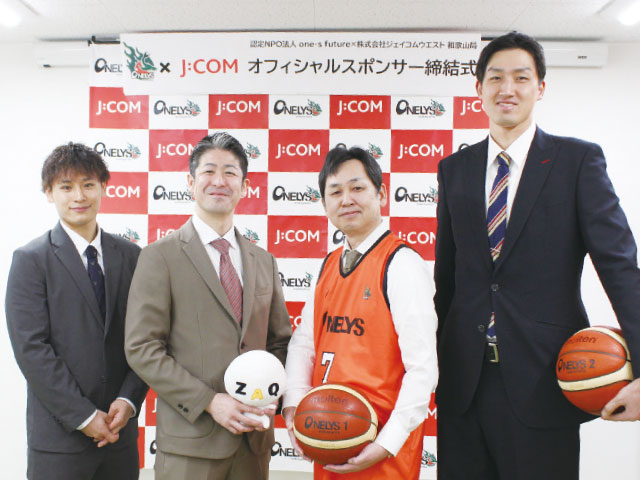 和歌山市を本拠地に活動するバスケットボールチーム「ONELYS wakayama」(以下ワンリーズ)が、「ジェイコムウエスト和歌山局」(以下ジェイコム)とオフィシャルスポンサー契約を締結。ジェイコムが掲げる「あたらしいを、あたりまえに」と、ワンリーズが目指す「こどもから大人まで、健常者と障害者が共存し新たな価値を創造する」という、お互いの理念が合致することから今回のスポンサーが決定。1月18日に締結式が行われ、ジェイコム和歌山局長の出口佳宏さん、ワンリーズ球団代表兼認定特定非営利活動法人である「Оnes future(ワンズ・フューチャー)」(和歌山市)の理事長を務める上田頼飛(よりたか)さん、同チームの選手・岡本将大(まさひろ)さんと山本浩太さんが登壇しました。