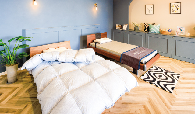 オンラインショップで「実物に触れたい」との問い合わせが多かったことから、昨年11月に体験型ショールームとしてオープン。高反発マットレスや枕など、新作や話題の寝装寝具が多数そろい、西川やロマンス小杉とコラボしたオリジナル寝具にも注目を。