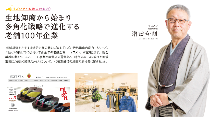 地域経済をリードする地元企業の魅力に迫る「すごいぞ!和歌山の底力」シリーズ。今回は和歌山市に根付いて百余年の老舗企業、「マスメン」が登場します。総合繊維卸業をベースに、EC事業や直営店の運営など、時代のニーズに応えた新規事業に力を注ぐ経営スタイルについて、代表取締役の増田和則社長に聞きました。