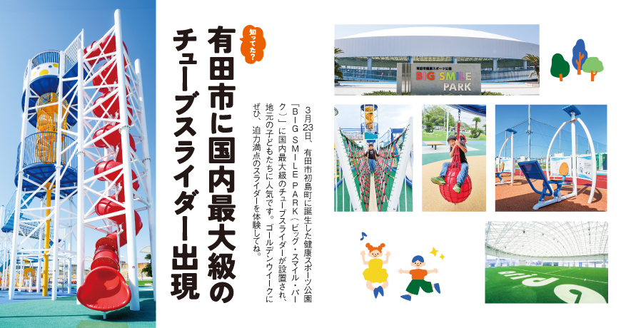 3月23日、有田市初島町に誕生した健康スポーツ公園「BIG SMILE PARK(ビッグ・スマイル・パーク)」に国内最大級のチューブスライダーが設置され、地元の子どもたちに人気です。ゴールデンウイークにぜひ、迫力満点のスライダーを体験してね。