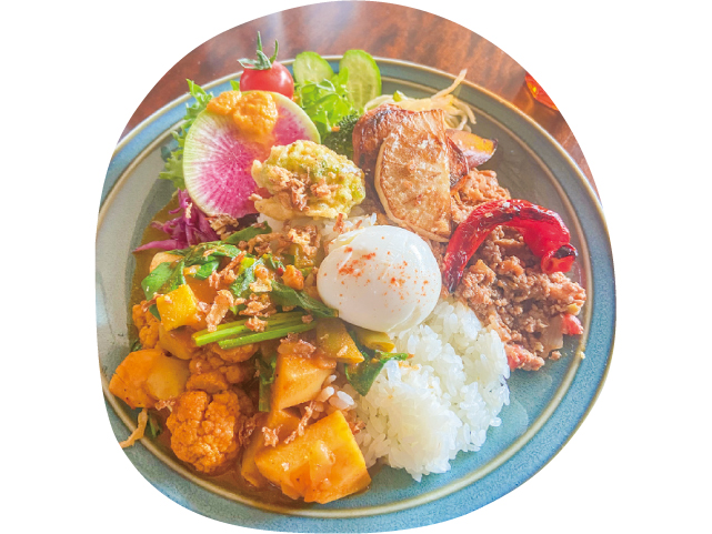 甘露寺前駅から徒歩約6分。“人と人をつなぐ”をコンセプトに、地域の交流の場として開いた古民家カフェ。旬の野菜をたっぷり使ったグルテンフリーのスパイスカレーを、日替わりで2種類用意。あいがけで提供しています。国産レモンで作る「レモネード」(500円)は売り上げの一部を「日本小児がん研究グループ」に寄付。
