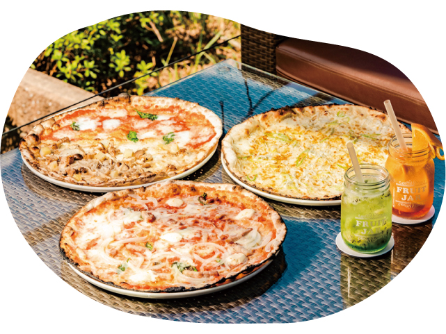 大池遊園内にあり、池畔の景色を眺めながら食事やスイーツが楽しめます。池の向こうを、貴志川線の電車がガタンゴトンと走る風景も魅力。広々とした店内席と開放的なテラス席は、日常を少し離れてくつろげる空間です。名物は、大きな薪窯で焼き上げる「ピッツァ」。朝から晩まで、さまざまなシーンで利用できます。