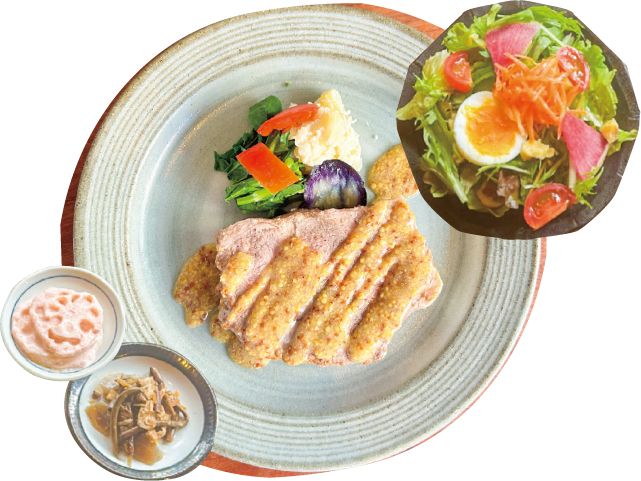 古民家を改装した店内は、梁(はり)を生かした和の空間にモダンなインテリアが調和し、大正ロマン漂う優雅な雰囲気が広がっています。人気の「小鉢ランチ」は、メイン料理に小鉢(4品)、サラダ、ごはん、汁物が付いてボリューム満点。その他、「ココットランチ」も楽しめます。スイーツとドリンクのセットも一緒にどうぞ。