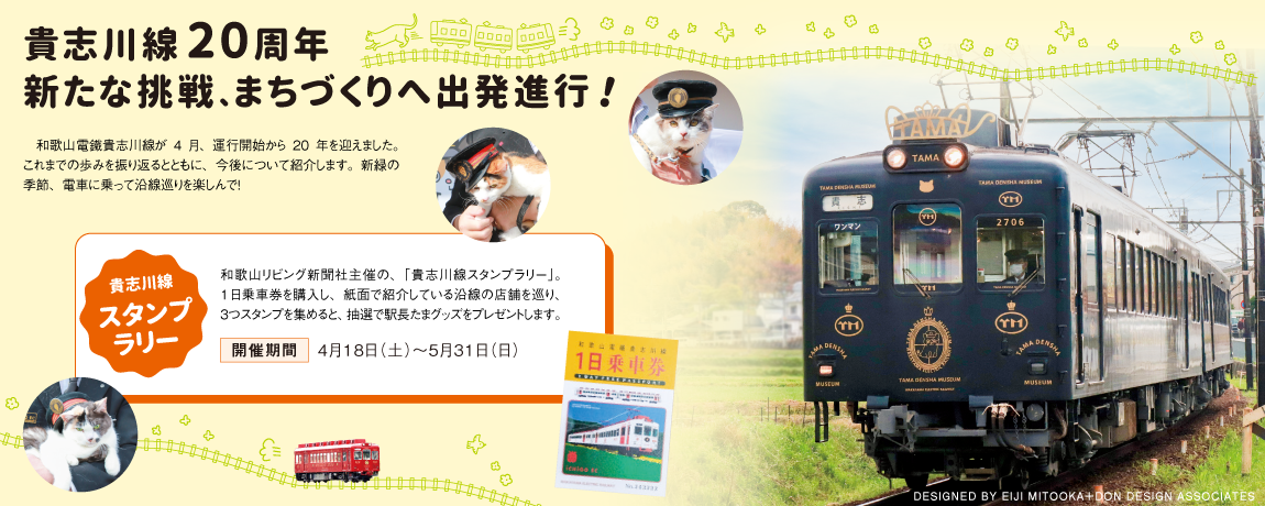 和歌山リビング新聞社主催の、「貴志川線スタンプラリー」。1日乗車券を購入し、2面で紹介している沿線の店舗を巡り、3つスタンプを集めると、抽選で駅長たまグッズ5000円分1人、3000円分2人、その他記念品17人(計20人)にプレゼントします。応募期間は5月31日(日)まで。