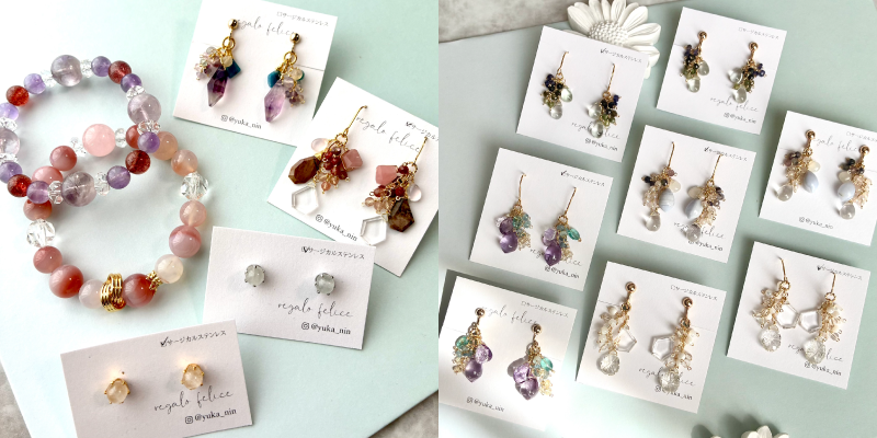 シンプルなデザインや華やかなデザインなど天然石の魅力が伝わるアクセサリーをご用意。天然石を身近に感じてもらえると嬉しいです。