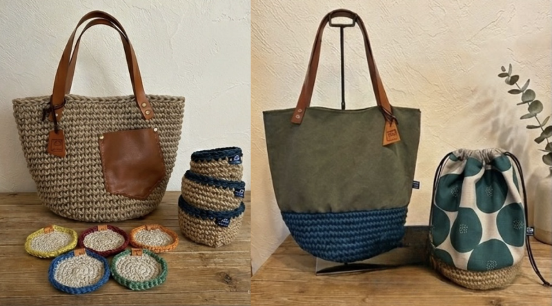 麻ひもバッグ、麻ひも帆布バッグ、麻ひもカゴ、麻ひもコースターなど