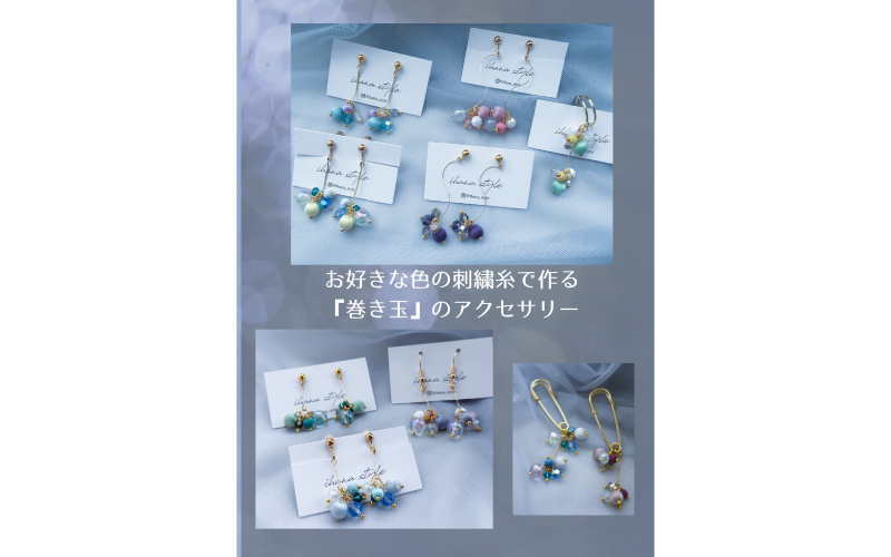 | 体験料 | 『巻き玉』耳飾り作り 2,750円 刺繍糸を巻きつけてつくる『巻き玉』で耳飾りをお作りいただきます。 各回13:00~、1時間30分~2時間、予約優先、定員4名 |