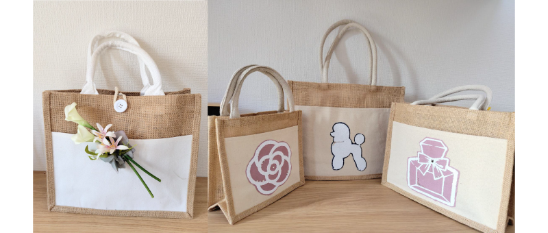 お花やモコモコシートを使ってジュートバッグを楽しく変身させましょう。