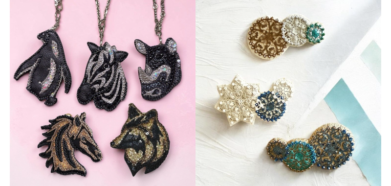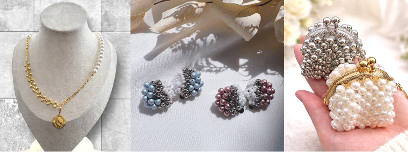 上品な中に華やかさがある大人綺麗めなアクセサリーを制作。最近は名刺ケースやがま口ポーチなども人気です。