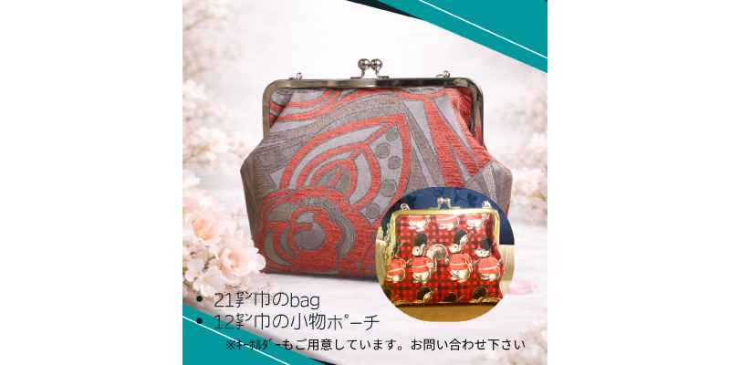 | 体験料 | 持ち手付きポーチ 4,950円 がま口bag 16,500円 キットを準備しておりますので、工作感覚でがま口をお作りいただけます。 ※写真はサンプルのため、生地が異なる場合があります |