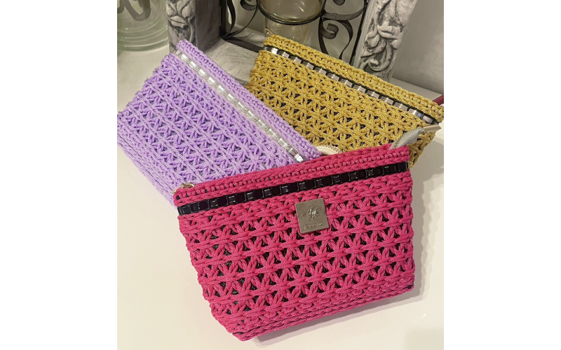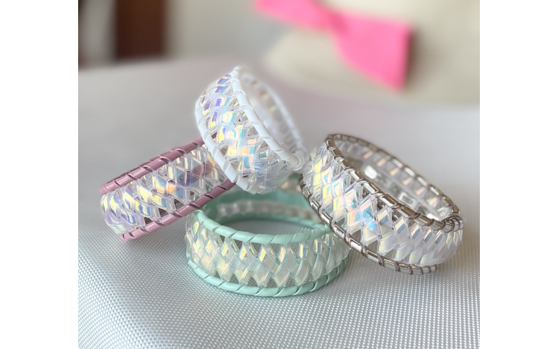 ジュエリーバッグ®︎とは、キラキラ輝くテープをネットに通したり、編みつけたりして作るハンドメイドのバッグです。高級感があり華やかさが魅力です。