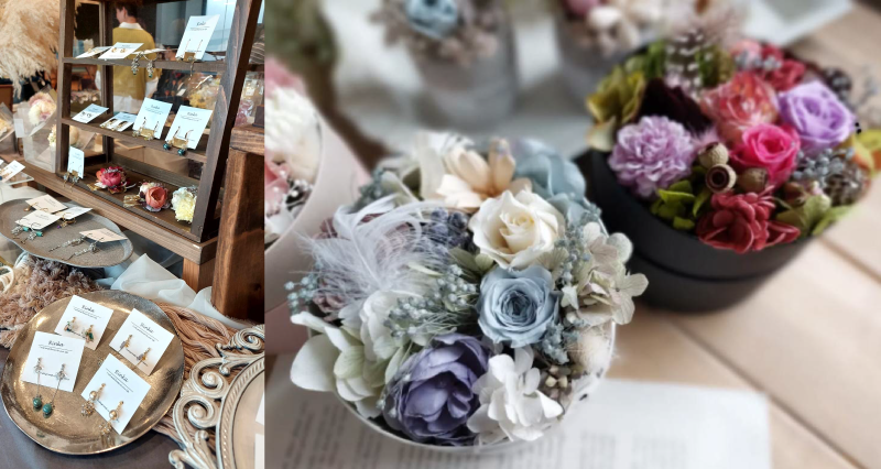 天然石や刺繍糸、本物のお花を使用した各種アクセサリー、洋服、バッグ、雑貨の作品販売など、人気作家が多数出店。またプリザーブドフラワーのアレンジやつまみ細工の体験や販売、手織りや花咲く書道体験も。