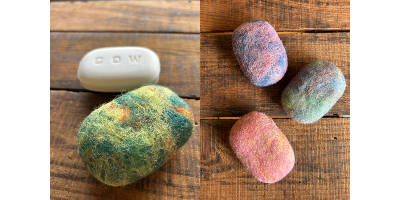 いろんな色の羊毛を混ぜて、マーブル模様のフェルト石けんを作ってみませんか?出来上がったら普段の手洗いに、またそのままお部屋に飾ってもステキです。※体験で作ったフェルトソープは、ご自身でお使いいただき、他の方への譲渡や販売はお控えください。
